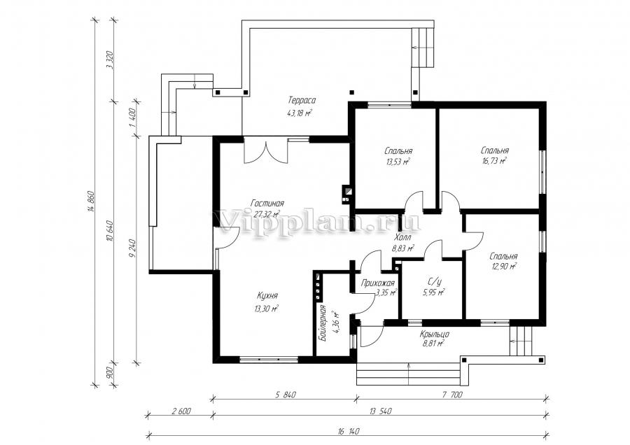Проект индивидуального одноэтажного жилого дома с размерами здания